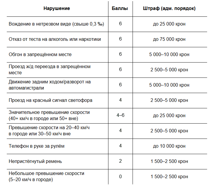 За незначительные нарушения штраф на месте составляет до 3 500 крон; за серьёзные правонарушения сумма, уплачиваемая полицейскому на месте, выросла до 5 500 крон. В рамках административного производства (когда дело передаётся в муниципалитет) суммы значительно выше.